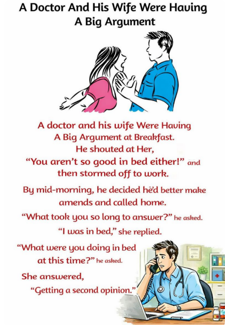 Stories about relationships often reveal more than they first appear to. This short yet clever story about a doctor and his wife has circulated widely online because of its humor, timing, and unexpected ending. Beneath its simplicity lies a sharp observation about words, pride, and quick wit.