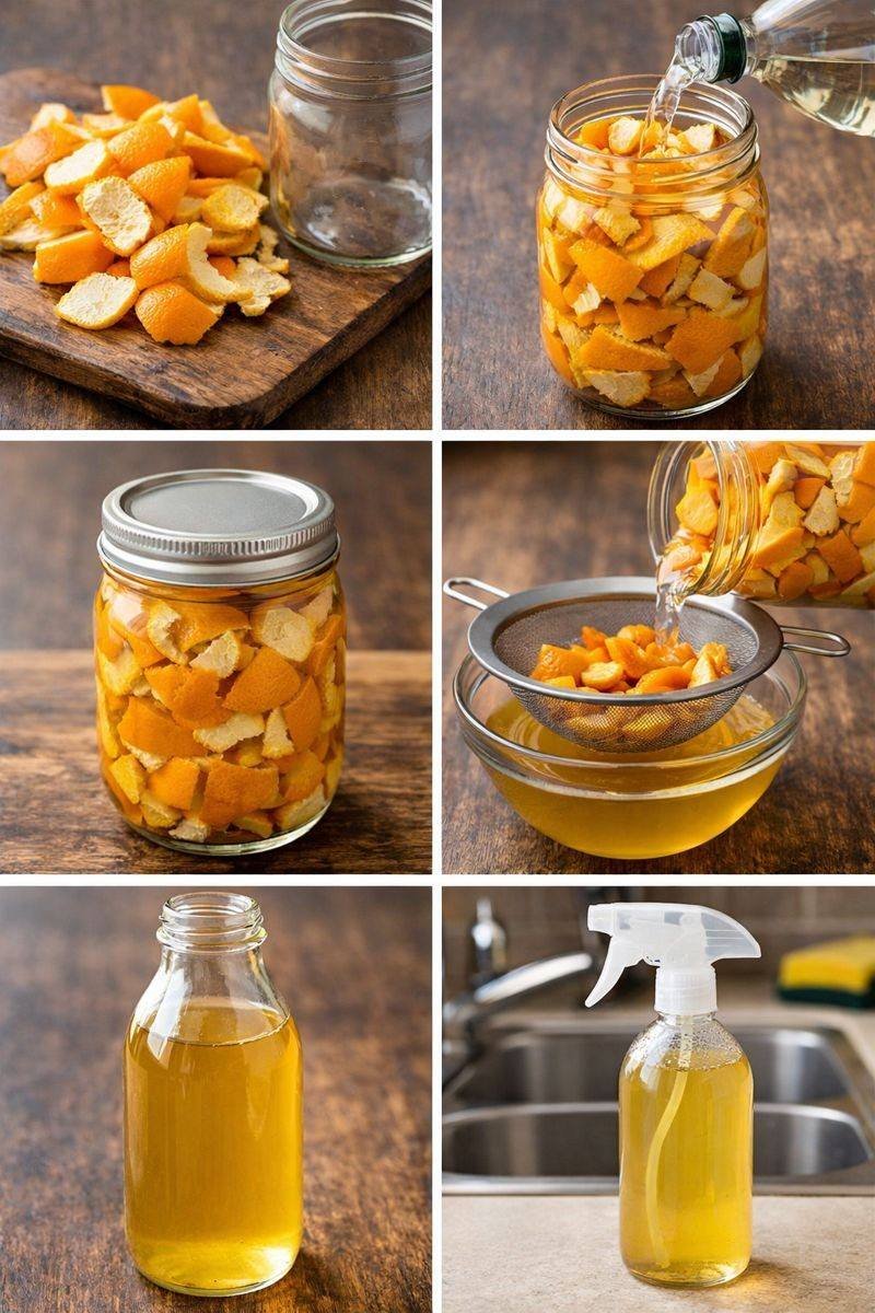 Orange peels contain essential oils with degreasing and antibacterial properties. White vinegar is a natural disinfectant and deodorizer. When combined, they create a fragrant, non-toxic cleaning solution.